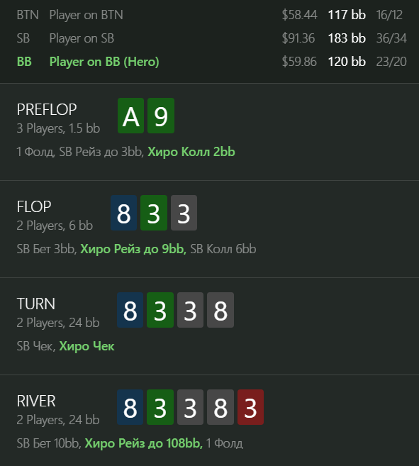 16\16 там наверно мало рук на него. как будто 3бет вообще не обязательный ну и постфлоп это пиздец. флоп колим донк с 2 аутами и хуйня что он дончит твою доску ага. тёрн на доске куча дров ты ставишь 10% как будто ни с 1 вэлью рукой ты 10% не поставишь и ривер лёгкий кол у него. я бы его конечно всеравно фишом пометил по большей части изза кола 3бета и донка флопа. но всё-равно 3бет плохой в этих позах 1би вникуда посути