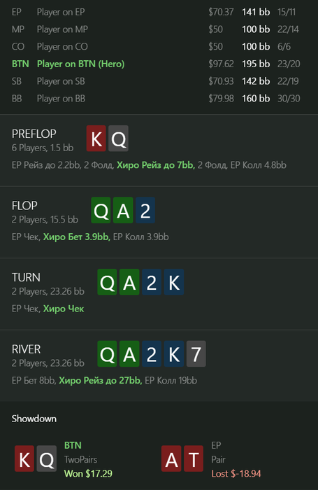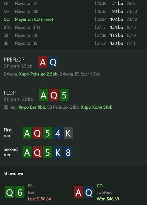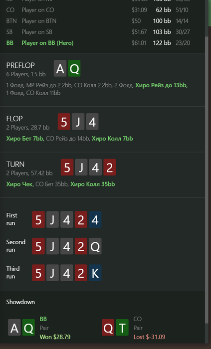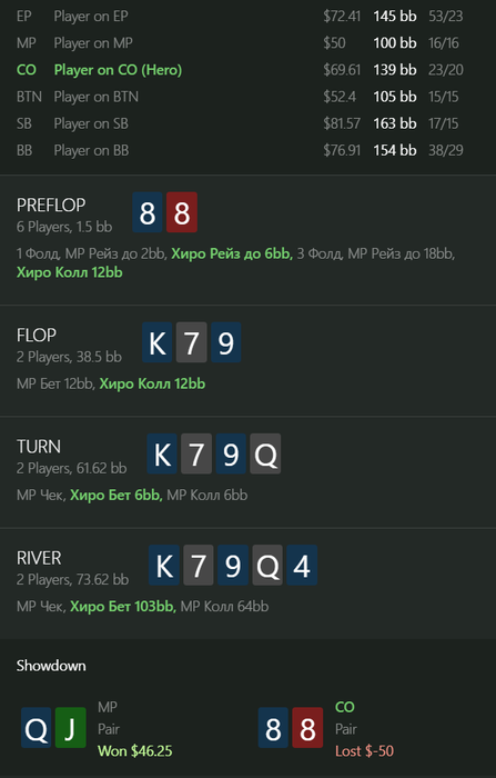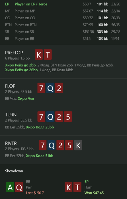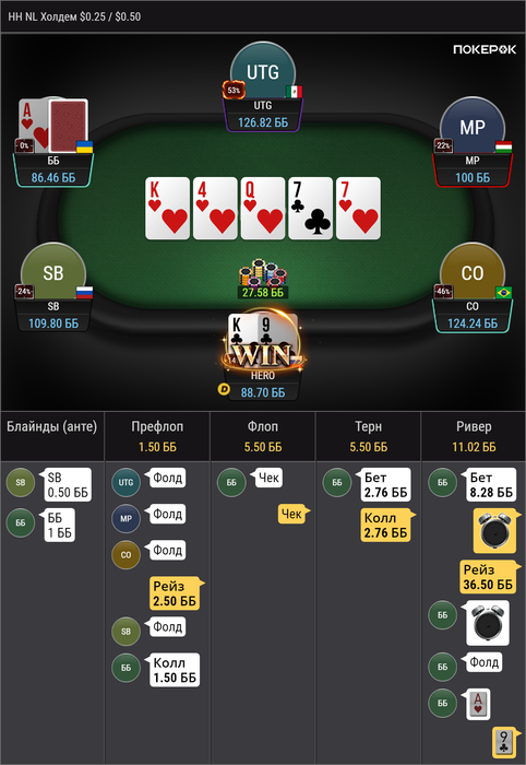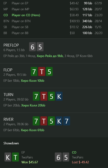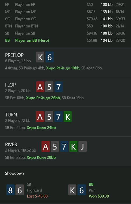 ku1er, это рег, играл с ним еще с nl25, впип показывается со стола а не общий, это 4 бет пот, 3 бет не обязательный, а колл 4 бета учитывая сайзинг хороший (я бы сказал обязательный), его 4 бет комментить не буду, флоп кол с бубой точно норм, терн наврное сайзинг плохой, но я думал, что буду получать ч-пуши часто и редко получать коллы на сайзинг 25% ( ну и велью 10% я могу сыграть много раз делал так), а ривер от него колл норм наверное в целом
