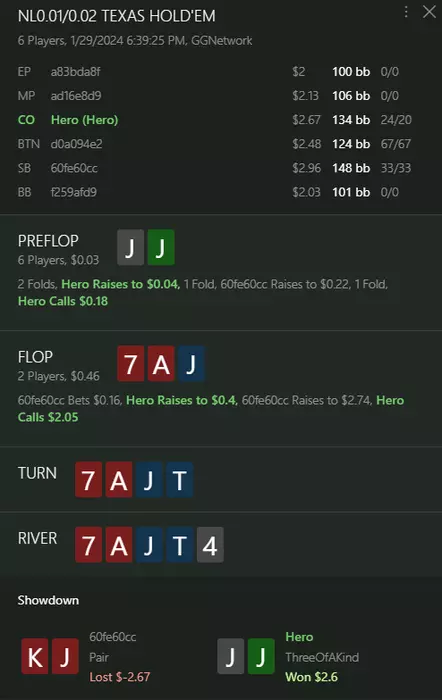 в раздаче с JJ ситуация похожа на ту что разбирали с QQ, сет на флопе и дальше тишина--я бы терн пихал--опп ждет дро, и даже если у него пара АА-он бы ответил на пих. А так не собрал ни с терна -ну ривер уже опстно играть.