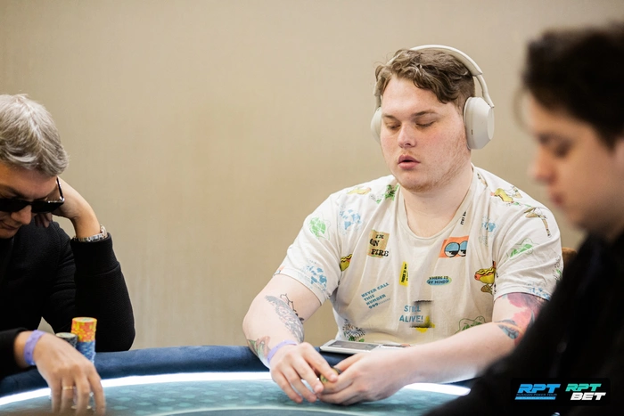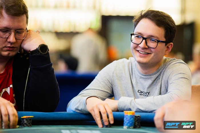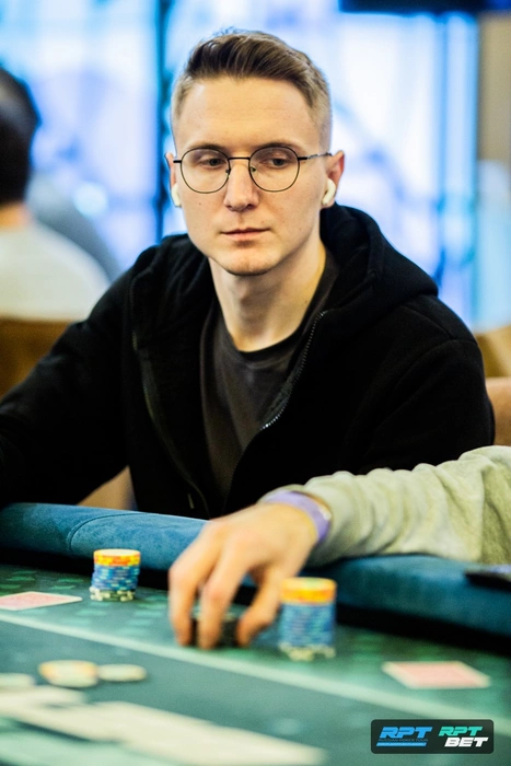 А рядом Игнатий Безменов открылся из середины 6к, получил следом плоский 3-бет 12к от Олега Машникова. Никита Дергачев поставил 4-бет олл-ин вхолодную. Оба оппонента сдались, а Никита удивленно повел бровями.