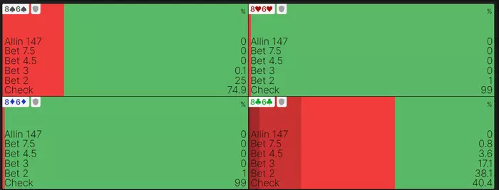Q8s 99,9% играются колом. В 3бет с весом улетают доперы, оэсд, вторые и первые пары со слабым кикером, слабые разномастные тузы и гатшоты. Ну и сэты из вэлью диапазона. На его ре-рейз 86 с крестом 99% играются колом и 1% 3бет. На 3бет Q8 машина предпочитает выкинуть, но вот Q7 заводит колом. По тёрну машина действительно предпочитает поставить не пол пота, а 3/4 и блок бэт по риверу. Пуш по риверу кстати всегда откалывает с мелкими флэшами. Более того, даже АА и АQ машина закрывает.