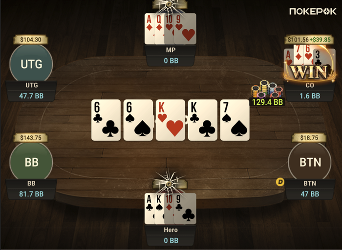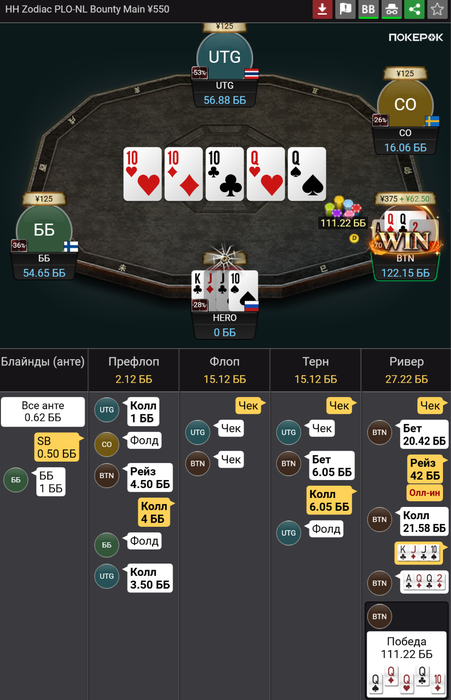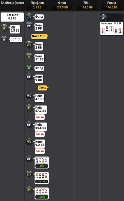 В середине турнира выкинул неплохую руку с А, оказалось у чела A95)А, а баттон зачем-то поехал на QQK7 Не знаю почему я сфолдил, обычно так не играю🤔