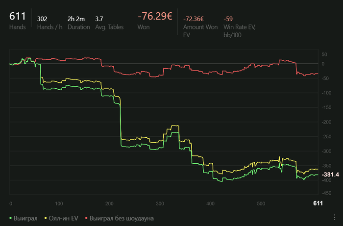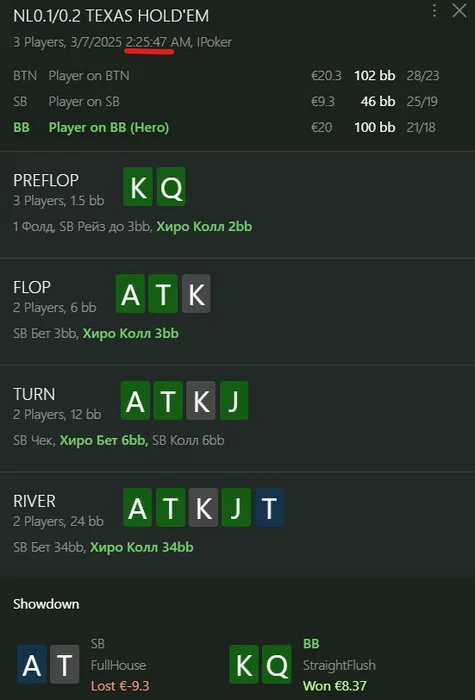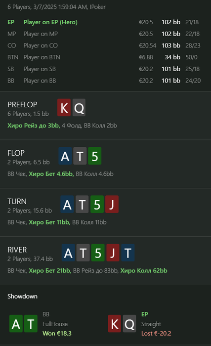 Мы почти никогда не выиграем на ШД, колл либо на сплит с KQ, либо посмотрим на фулл. Опп - тайтово аггресивный рег, статы ШД 26 \ 59 \ 46