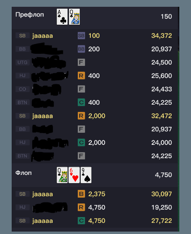 Мысли на флопе: "У оппа нету АА, КК части QQ и АК. С дровами в IP скорее всего просто коллировал бы cbet, значит хочет выбить слабую часть диапазона (JA, JJ, 1010?) или добрать от сильной части диапазона (от моих АА, КК, AQ)😅"