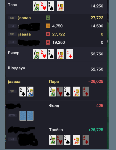 На терне вообще растерялся. Если сыграть ч/к то на ривере спр<1 и как будто здесь и сейчас нужно было решаться над фолдом или выставлением. Выбрал легкий путь😆