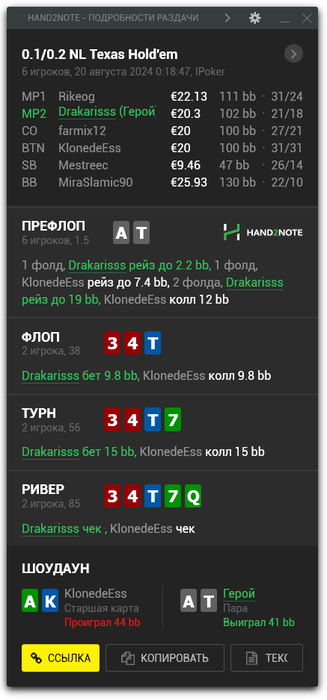 Ривер: Ну как будто бы и нет других вариантов, кроме чека. Доехали КД-АД черви, если таковые играли чек кол. Доехал сет. А его возможные АА с картой в масть, так и остались оверпарой к борду. Решил играть чек-фолд, но опп чекнул и показал АКо.