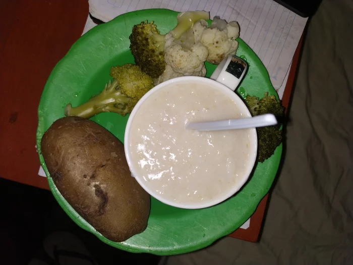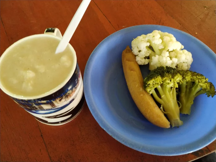 Овсянка или рис и брокколи, цветная капуста и картошка или плантан (банан).