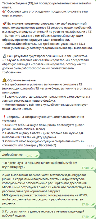Она создала конфу в телеге, куда скинули тестовое. Тестовое достаточно большое - я оценил его на 25 часов. Хз, мне кажется, такие тестовые давать неадекватно, но в моем случае мне нужен опыт, поэтому сделаю и не буду выебываться. Там ещё нужно упаковать в Docker и задеплоить. То есть придётся ещё и на сервак потратиться.