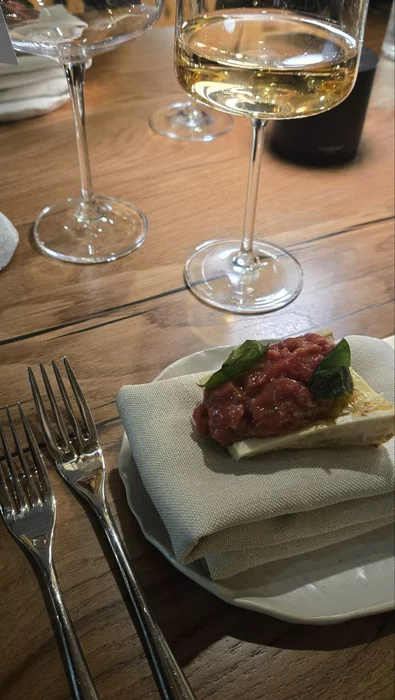 Второй курс: Тар тар из конины, на сахарной косточке в сопровождении с розовым игристым вином Дамани (Грузия).