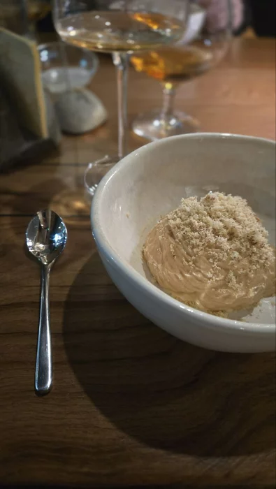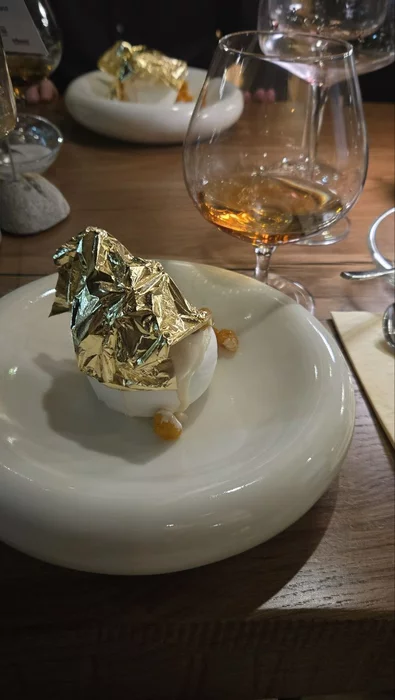Пятым и шестым курсом были десерты, мороженое из Балкаймака с хрустящей меренгой, и чайная эспума с иримшиком. В сопровождении коньяка.