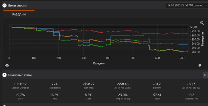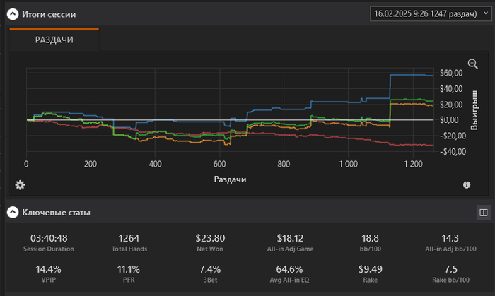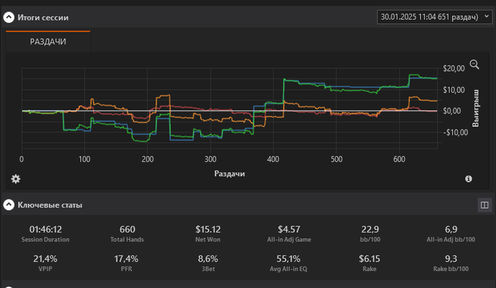 Привет всем.На работе запара, пашу с 9 до 9,до середины февраля так будет, не получается в покер катать.Прошел промежуточный разбор базы с тренером гринлайна.Он сказал,что у меня все ок по игре, есть небольшие моменты,где надо игру подкоректировать, но в целом он уверен что я смогу побить и нл10 и нл25,что очень радует.Сегодня получилось сыграть небольшую сессию.Два раза ДД устояли против АК префлоп,поэтому переап на графике