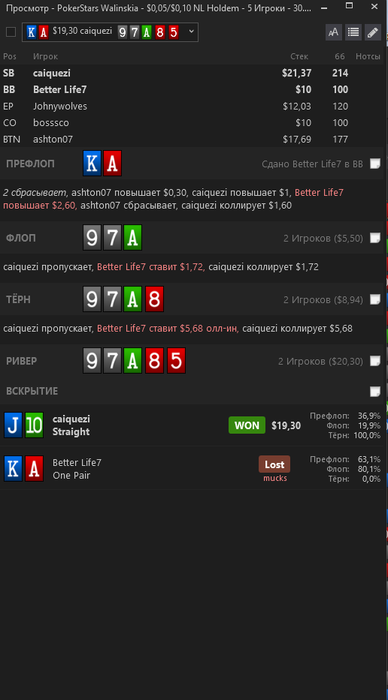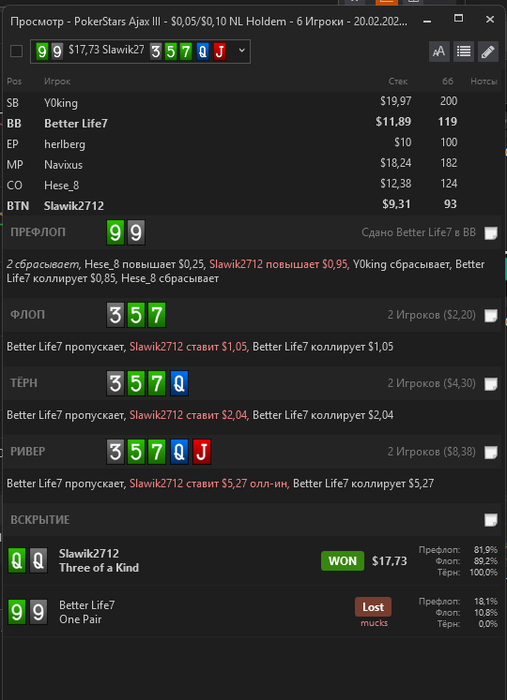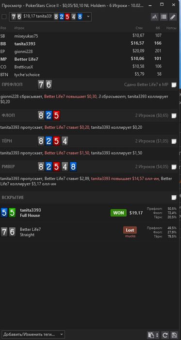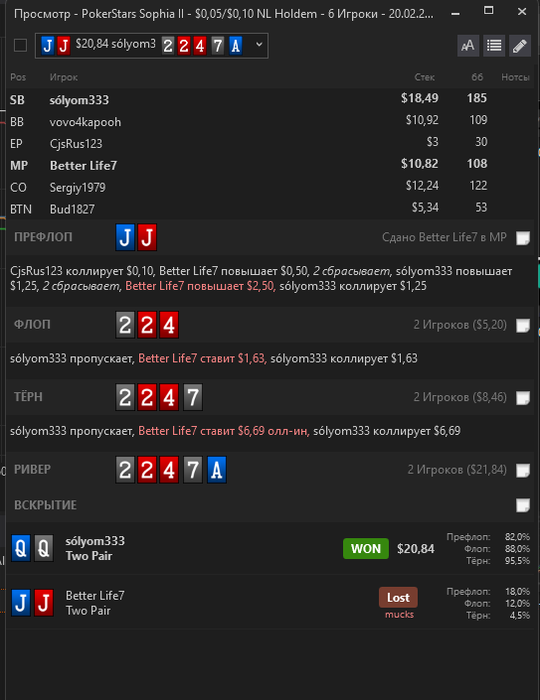 Сегодня так,почти камбекнул,с тремя баксами из сундука сегодня в -0.27$ отыграл.Сдавали сегодня не очень,премиум руки не оплатили ни разу ,изолировал фишей,но в доску они попадали лучше меня.Ожидаемо после 4 плюсовых сессий подряд,отделался легким испугом.Но и пару ошибок тоже сделал.