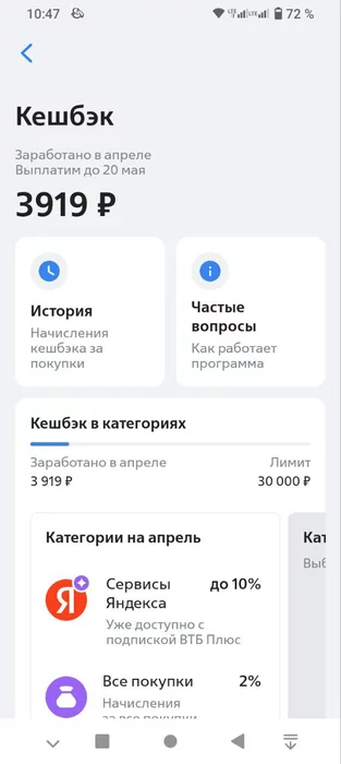 Еще плюшки, привязываем карту ВТБ к сервисам Яндекс, и на АЗС дополнительно (сейчас акция до конца месяца) скидка 5р/литра на АЗС. т.е. мы дополнительно получаем кэшбек от ВТБ и скидку от сервисов Яндекса. то же самое с доп.категориями если они совпадут с основной категорией они будут суммироваться