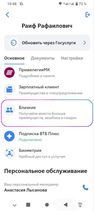 добавляем группу близкие, надо добавить пользователя ВТБ. с этой группой по умолчанию все супермаркеты 5% (проверил КБ и Бристоль - реально 5%) - а у нас доставок много из этих магазинов.