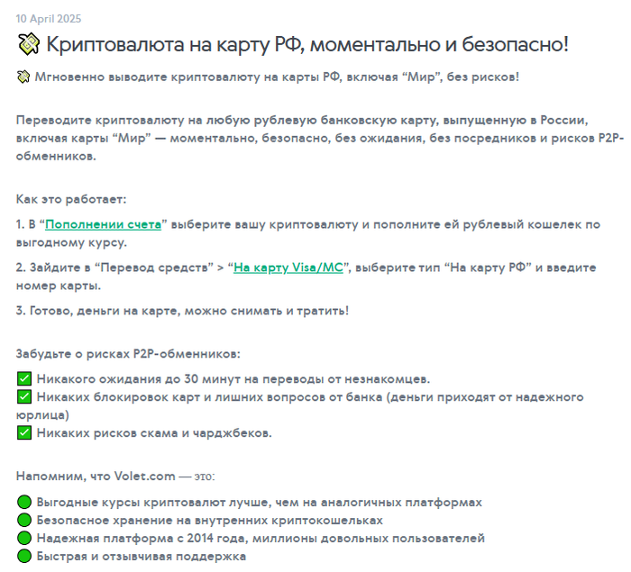 Преимущество в том...что из крипты я не вывожу...я ей плачу. Это не перевалочный пункт для вывода..это для оплаты. Для вывода лучше искать другие методы, сразу скажу что лучший - это вывод сразу в нал.