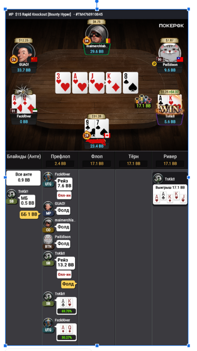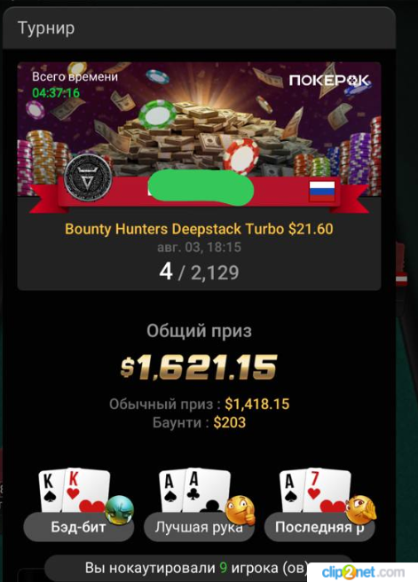 Мы еще не в деньгах, за оппонента увеличенный нок 8.75 долларов, то есть он одного оппонента тоже уже выбил из турнира.