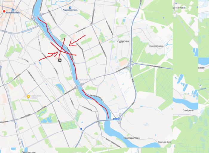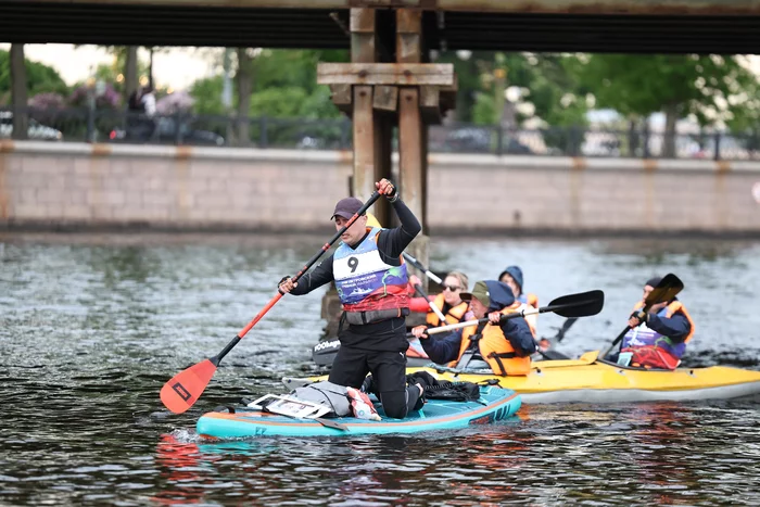 Первая важная отметка. Кировский мост. На берегу подоспела моя поддержка. В этот момент я присел на колени, чтобы уменьшить сопротивление ветра. Течение в районе моста хорошее.