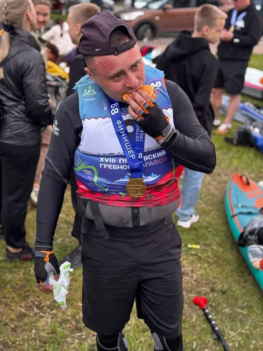 Как же классно было сойти на берег. Я просто рухнул. Сил вообще не осталось. Руки не чувствую, начинает трясти от холода или эмоций. Жена обнимает, на шею вешают медаль, друзья поздравляют. Я от бессилия смотрю в одну точку и кушаю бургер, который мне принесли.