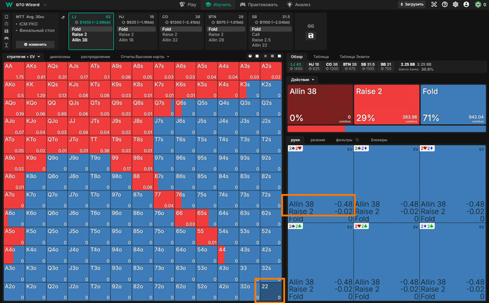 22 ПАС, есть конечно ситуации когда мы их можем открывать с ранних, но это при условии что мы большой чипак и что соперники пассивные.