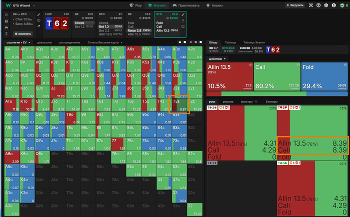Именно наши Т3h Визард больше хочет коллить чем пушить, так как ЕВ у наших в 2 раза больше чем у других сьютовых, мы хотим оставить больше блефов и полублефов и мы блокируем часть ФД которые младше нас и могут так сыграть.