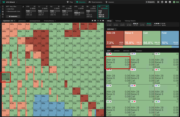 Визард тут хочет КОЛЛит в 20% сучаев... я бы в этой ситуации КОЛЛил в 100%, так как на блайндах 2 фиша.. но не в коем случае не стал бы рейзить как Визард слабые офсьютные тузы и часть бродвея, так как открывается коротыш.