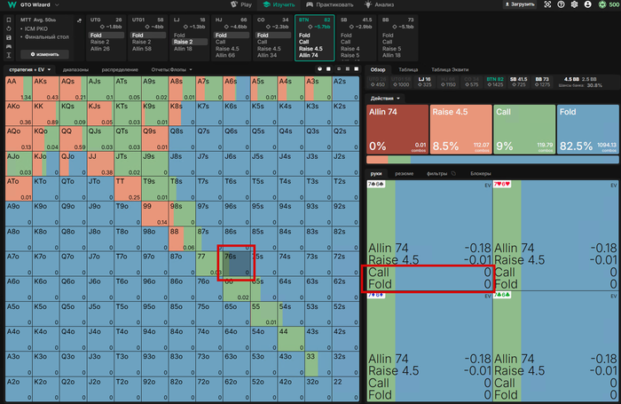 Визард хочет КОЛЛить в 100%... несмотря на то что ЕВ КОЛЛа и РЕЙза одинаковое в диапазоне K8o-, Q8o-, бОльшую часть нижнего диапа мы ходим рейзить, а меньшую КОЛЛить, с верхами наоборот🧐