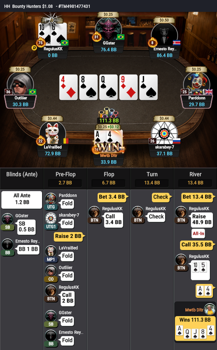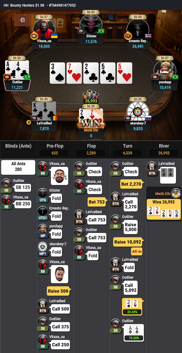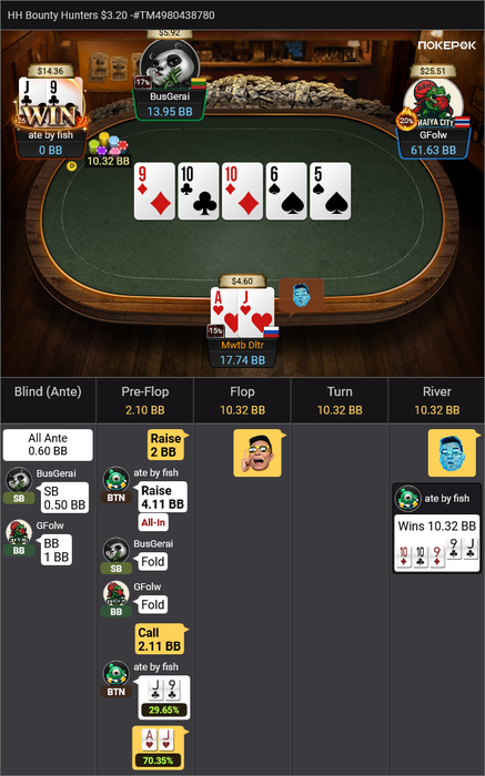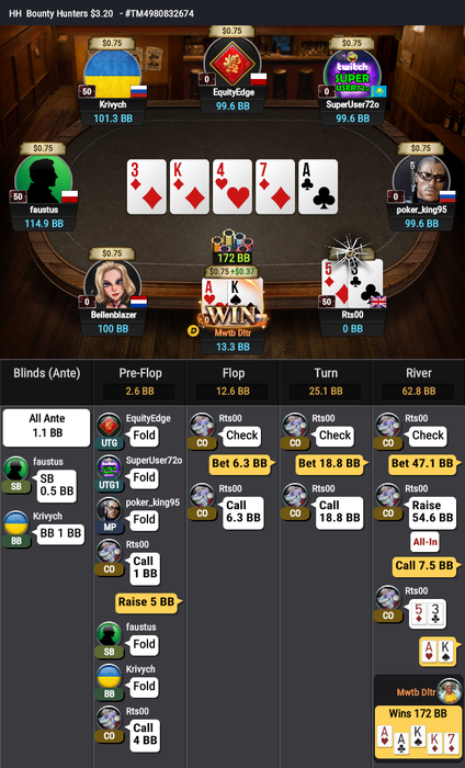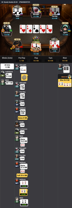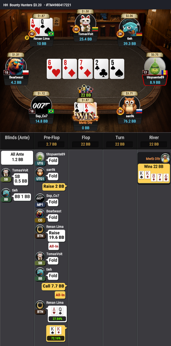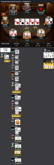 Сначала проиграл AJs<A4o и укоротился вдвое, следующей раздачей вылет с QQ<22<97s.