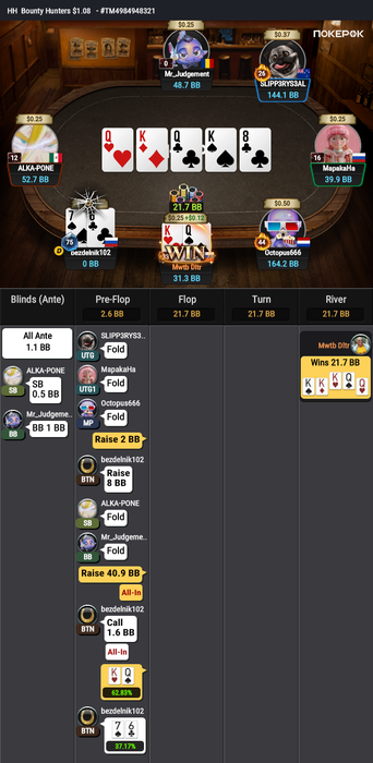 Nutscracker708 @ 15.09.25И черт меня дернул во время важной раздачи открыть нотсы на другом столе, и пошли бешеные лаги.