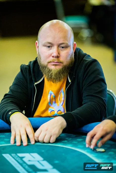 Дмитрий Шкуратов (220к utg+1) открылся 16к. Озвучил пуш 48к с Николай Якут с HJ. На большом блайнде Андрей Грубенко нашел и зарепушил 100к, Шкуратов заколил с .