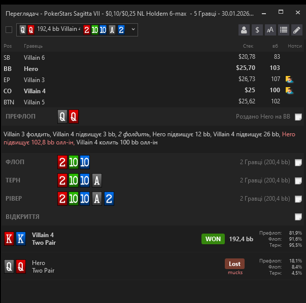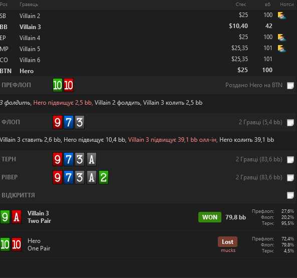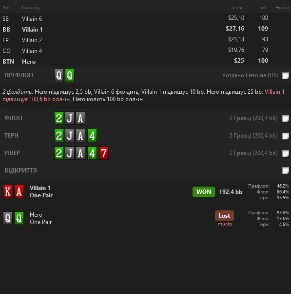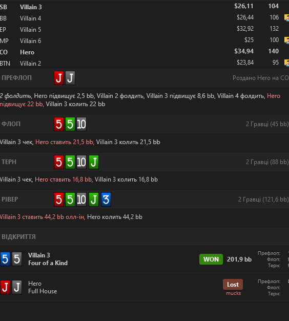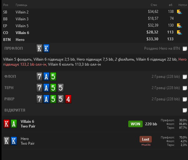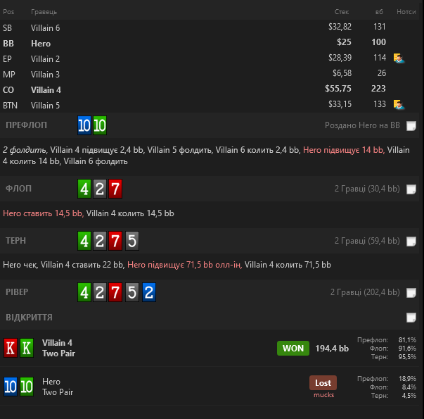 Сел за столы сразу после анонса. Состояние было так себе — легкое раздражение. ГСЧ решило устроить проверку на прочность с первых же минут: 6,5 стеков испарились за 140 минут. Пачка «красивых» раздач сразу дала понять, что легкой прогулки не будет, и раздражение ожидаемо усилилось.