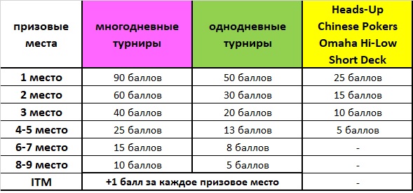 Очки начисляются в турнирах за попадание в ITM (фото). По итогу серии: