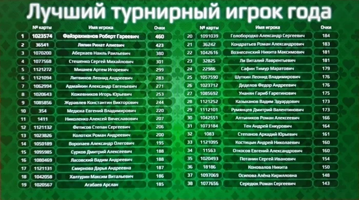 Начиная с февральской серии и до декабрьской включительно, будут начисляться рейтинговые очки за ITM в турнирах. Система начисления очков идентична лидерборду лучшего игрока серии. По завершению декабрьского чемпионата, мы определим лучшего игрока года.