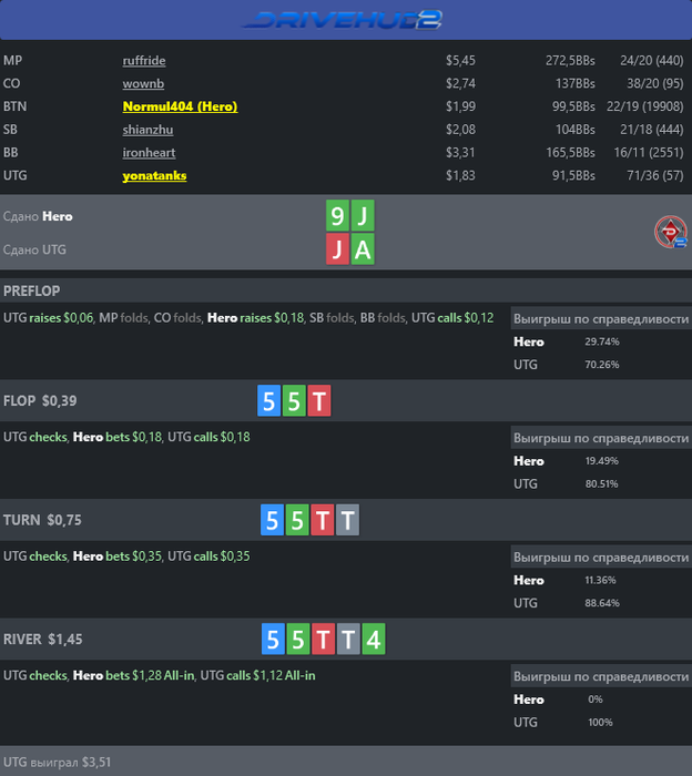 Фиш в позиции на нас на ББ. На блайндах сайзинг трибета должен быть ×4,5. Глядишь бы 9-ки сбосили. SB Вообще худшая игровая позиция и подразумевает кол только в крайнем случае.