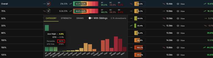 alchx, зачем вообще таким странным образом определять переблеф или недоблеф? Смотреть надо на наполнение диапазона в конкретной линии: какой процент рук мы будем бить с нашим потенциальным блефкетчером.