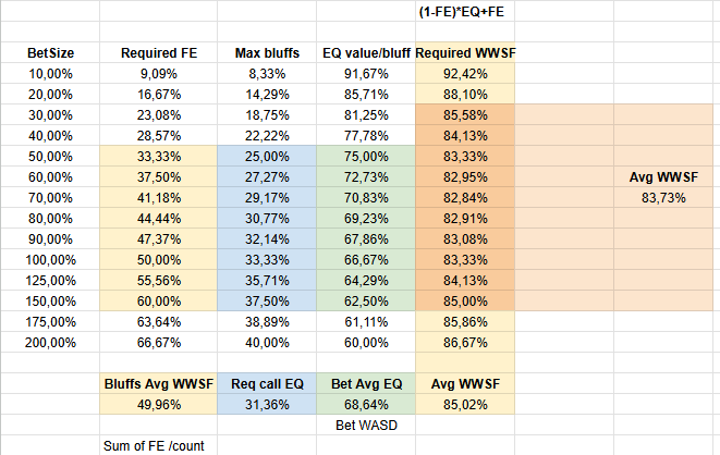 В каких условиях должен? Поляна же не коллирует в соответствии с частотами минимальной защиты. На треть, например, нужно коллировать в 75% случаев. А реальное поле может коллировать где-то в районе 45% или что-то около того. В таком случае WWSF должен стремиться к показателям - 0.45 * 0.8 + 0.55 = 0.91 (ссорян, несколько раз начудил в рассчётах, но теперь вроде правильно). Не лучше ли вообще смотреть по выигрышу на вскрытии?