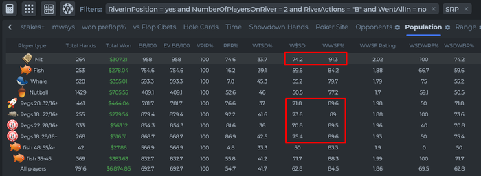 Вообще говоря, ориентироваться на показатели выигрышей далеко не идеальный вариант, так как у этой метрики есть свои недостатки, главный из которых заключается в том, что она не различает вэлью по уровню тонкости - мы можем проигрывать со своей рукой в 49% случаев, но формально это всё равно будет вэлью. Есть, наверно, более точный способ, когда у нас есть своя градация рук, что следует считать вэлью, а что блефом в зависимости от спр и размера ставки, но и тут будут тонкости на различных текстурах и в разных спотах, которые все не учтёшь и не сведёшь в одну простую схему.
