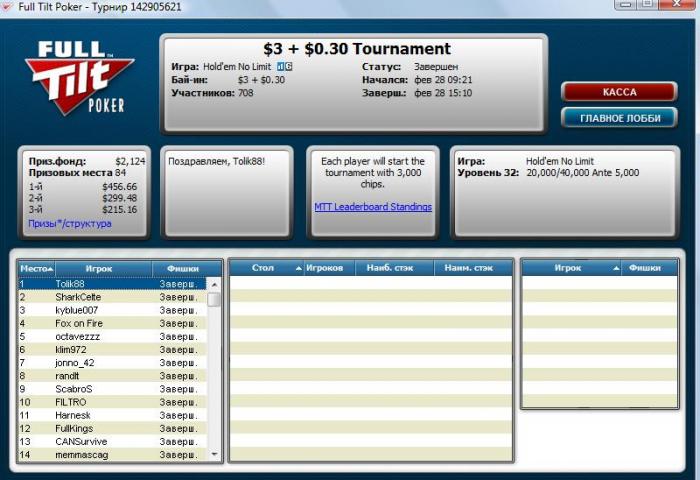 OneF @ 3.3.2010, 11:33 Когда вышел на финалку отписывался в ветке ТАЩУ! Решил и тут поделиться :) Затащил 2 место в 6 макс турбо 2,2$ на ПС было 4300 тел и 8600$ призовых +1к$ в ХА вышел против огромного чипака с 1лимоном против 11, была надежда, но удача оказалась не на моей стороне :)