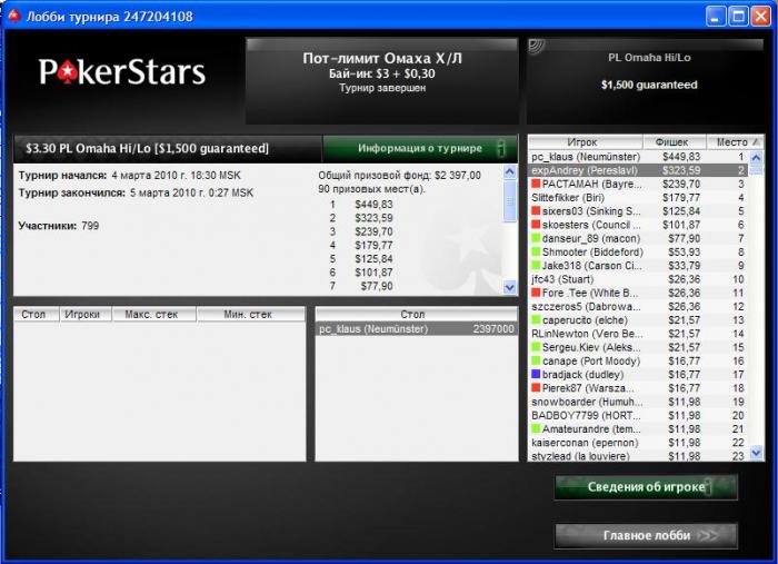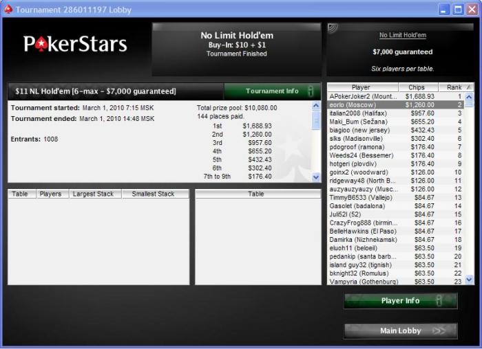 Когда вышел на финалку отписывался в ветке ТАЩУ! Решил и тут поделиться :) Затащил 2 место в 6 макс турбо 2,2$ на ПС было 4300 тел и 8600$ призовых +1к$ в ХА вышел против огромного чипака с 1лимоном против 11, была надежда, но удача оказалась не на моей стороне :)