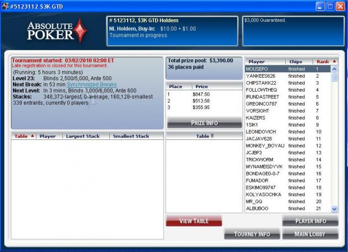 Когда оставалось шесть человек, оппы начали предлагать дележку. Там в основном американцы были и они к утру подустали. А у меня то разгар дня и азарт как раз проснулся, стеки у всех глубокие, можно поиграть нормально. Я и заупрямился. Они меня пообещали на 6ом месте отправить :)