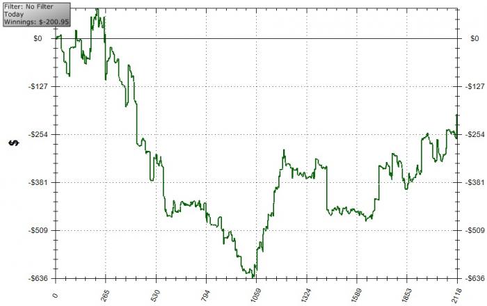 День гавно. Игру сегодня вообще не мог найти. В итоге отыграл едва больше 500 рук. Недобрал 100 по ЕВ, и еще в 3бет поте чувак на флопе 788сс замутил чек-рейз по JTо, я просто кольнул и он поймал свой гадшот на терне и запушил свой огрызок в неслабо раздутый пот (на разницу с ЕВ за сегодня повлияло не в мою сторону). Итого: залил 260$. Но, учитывая, как меня имели последние 200 рук это я еще очень легко отделался. Т.к. последние 200 рук играл НЛ50 с нормальным таким фишом, но столько кулеров, как за эти 200 раздач я не ловил, наверное, даже за последние 5000 рук. Чувак очень жестко с меня недобрал. Стрит во флэш, две пары в две пары, трипс в стрит с флопа и т.д. и т.п. Короче, не смотря на результат и не самое лучшее моральное состояние, играл сегодня неплохо.