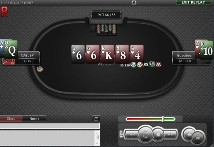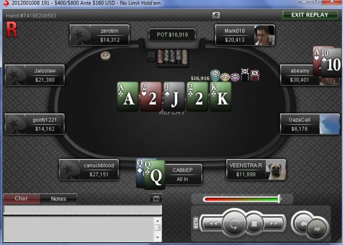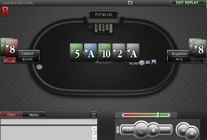 Seat 8: CABbEP (big blind) showed [Kc Ah] and lost with two pair, Aces and Threes