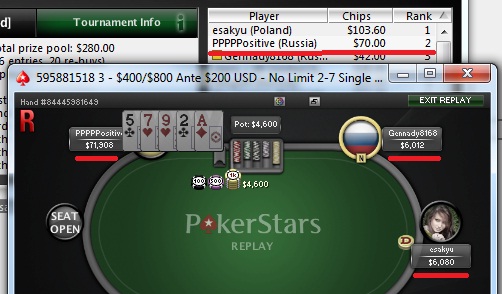 upd: - в таком же турике через 2 часа шел чипаком полтурнира, на финалке вылетел 6-м при 4-х призовых.Лоу до 9 готовая гладкая впоролась в обмен 1-й до 8 - в стадеХ турборебай, шел чипаком полтурнира, на финалке вылетел 4-м при 3-х призовых. (J2)J мои , я рейз, ререйз от дамы, колл, пришла 2, ему К, выставились, на 7-й у него закрылась вторая пара к даме