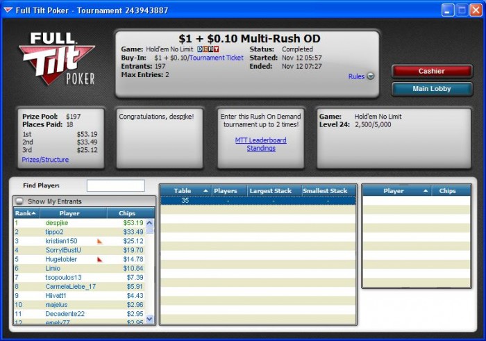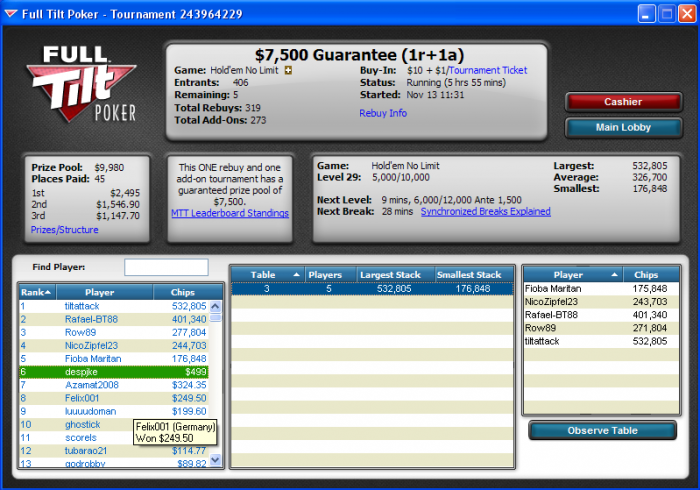 Poker Stars $3.00+$0.30 No Limit Hold'em Tournament - t600/t1200 Blinds + t150 - 9 players -