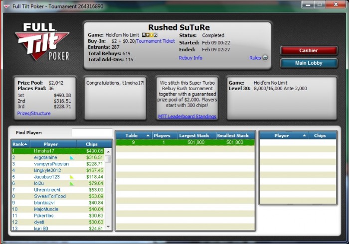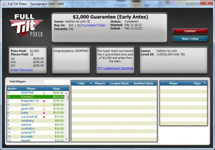 Full Tilt, 5,000/10,000 blinds, 1,000 ante No Limit Hold'em Tournament, 7 Players