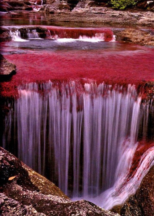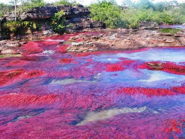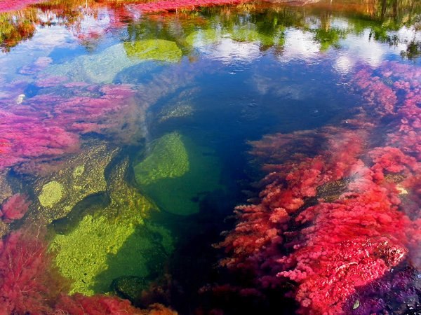 В Колумбии есть река под названием Каньо Кристалес, она же «пятицветная река» или «река пяти цветов». Каньо Кристалес берет начало на юге гор Макарена в колумбийской провинции Мета и течет с запада на восток, впадая затем в реку Гуайяберо. Каньо Кристалес – совсем небольшая речка длиной всего лишь около 100 километров и около 20 метров шириной, но скромные размеры не мешают ей быть одной из самых красивых и знаменитых рек мира. Пять цветов Каньо Кристалес – это красный, зеленый, желтый, синий и черный. Красные оттенки воде придают уникальные местные водоросли Macarenia clavigera, зеленоватые, желтые и черные – другие водные растения и речной песок, а синие и голубые – отражение неба в воде. Зрелище получается поистине фантастическое – речная вода играет сотнями цветов и оттенков, плавно переходящих друг в друга. Удивительное разнообразие цветов Каньо Кристалес приобретает в период с июня по ноябрь, на протяжении нескольких недель между сезоном дождей и засухи. Именно в это время доступ к реке открыт для туристов, однако полюбоваться пятицветной рекой не так-то просто – чтобы увидеть Каньо Кристалес, нужно сначала добраться самолетом до небольшого колумбийского городка Ла-Макарена, а затем отправиться в сложный поход по туристическим тропам в национальном парке, через который течет река. Впрочем, все трудности стоят того – только посмотрите на эти фотографии радужной реки.