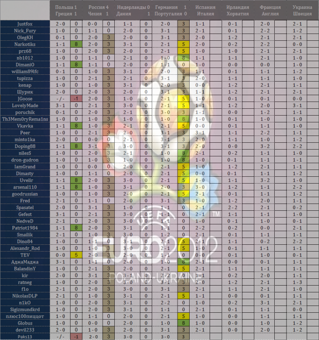 Самое интересное что кэф на Данию в районе 6.6-7.0 в мире, то есть по теории вероятности (?) )из 46 участников хотя бы 6 человек должны были поставить Данию, и это еще статистика на вроде как понимающих людей, а что тогда творится во всем мире? Все ж поголовно Голландию берут => поставил призовой фонд на Дачтан