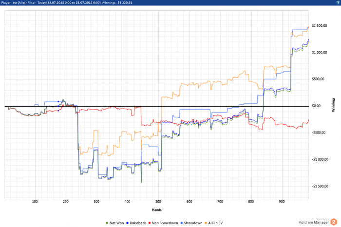утро понедельник, как утро понедельника- начало стандартное флеш во флеш, топ пара в 3бетпоте в лучшую тп, комбордо в 3 бетпоте на 3х - не катит, сет тузов бет-фолд на ривере, КК делит банк с АК но потом как-то устаканилось и парни напихали блайндов. Вот покерстарс-про инста запушил терн. Ну а че, изи бьет 99, например!