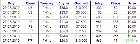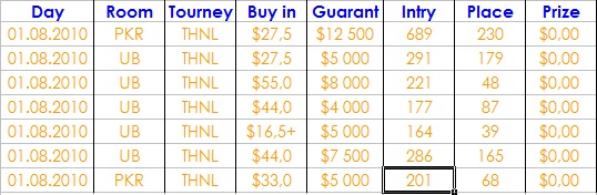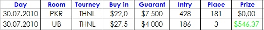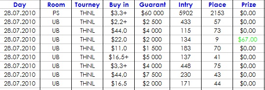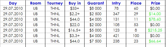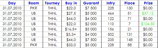 Ситуация такая, что после заносов в начале месяца я больше ничего не могу выиграть. Ничего не получается, меня постоянно переезжают – сверху, снизу, сбоку… я ошибаюсь сам конечно тоже. Банкролл вернулся в исходку. Сейчас я думаю, что после поднятия его до 8200$ нужно было полностью переходить на ЮБ и играть там ночные туринры с микрополями и ОЧЕНЬ сладкими оппонентами (сейчас представляю и аж слюньки текут)))) Все такие такого безобразия как на ФТП и ПС со мной никогда не делали на ЮБ, а отыграл я там приличное число турниров. И это заставляет задуматься. Нет здесь можно играть в плюс, но только не с моим банкроллом, такие откаты он не выдержит)))…. С завтрашнего дня я перехожу пока что полностью на ЮБ (играю вечером) и буду набивать там банкролл для ночных классных ))) турниров – это теперь моя цель.