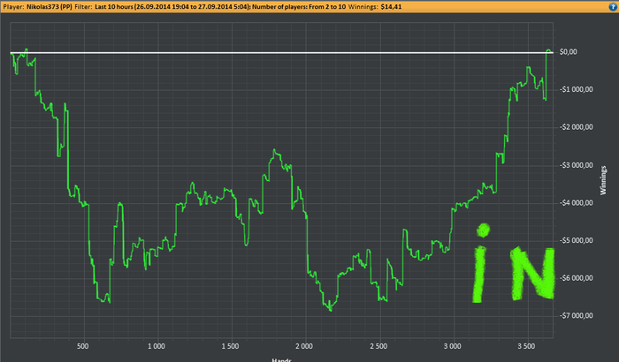 Nikolas373 @ 27.9.2014 Сегодня была отличная ночь. Бест камбек! Это даже приятнее бест дея Не считая суммы залива, среди обстоятельств сегодняшнего достижения был клиент пати, который выбивал 6 раз, викидывая меня с половины столов. и со всех вейтлистов, + 1 раз выключали свет, всего вторая сессия после перерыва(первую минусанул с ужасным, непростительным тильтом). Но я не сдавался и каждый раз продолжал катать, странно но все время продолжал верить что отмажусь. Успех пришел не сразу, но со второго захода. Это WIN