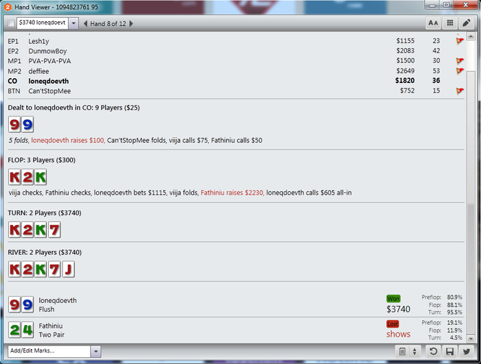 ATB87, ну я, мягко говоря, не в восторге. Если в том месяце вырезать 4 тильтовых дня, там будет более +1к по ев. Жаль, так нельзя сделать Но это не оправдание, я знаю, что на самом деле могу играть с отличным ев бб/100 по крайней мере на 25, а это уже немало $. Лишнее подтверждение того, что наш самый страшный враг - мы сами.
